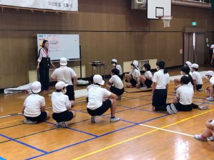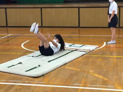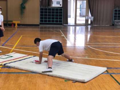 マット運動では、ペアでめあてを決めて、さむざまな技にチャレンジしています。