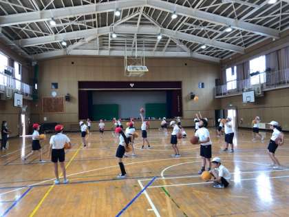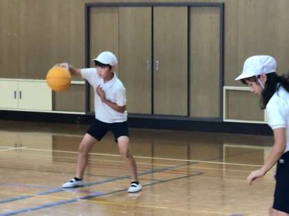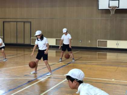 バスケットボールのドリブルの仕方やキャッチの練習をしました。