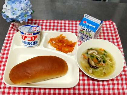 今日は、えびのチリソース、中華スープ、ヨーグルト、黒糖パン、牛乳でした。給食室で下味をつけ衣をつけて丁寧に揚げた海老を手作りのチリソースに絡めました。