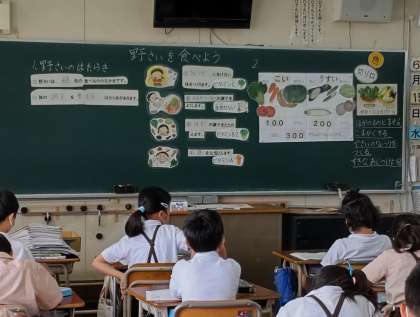 4年生では「野さいを食べよう」の学習をしました。大事な働きをする野菜を給食では100g摂れるように作っています。1日300g食べるためにはどうしたらよいか考えました。