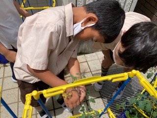 「ここのね、Yになっているところからちょっと出てるのが、わき芽だから、取らないといけないんだよ。」と、友達に教えていっしょに取っています。緑のミニトマトやきゅうり、ピーマンなどができ始めています。