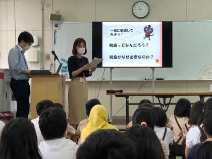 京橋市税事務所の方々に来ていただき、出前授業を行いました。