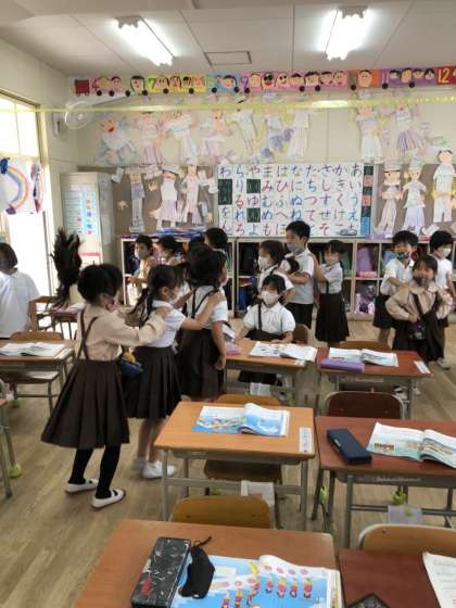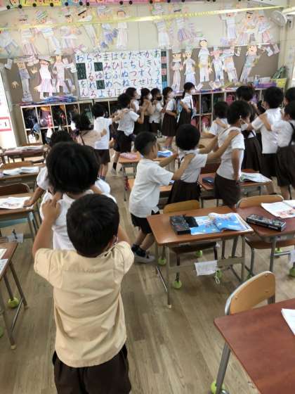 「ジェンカ」に合わせて、ステップを踏んで楽しんでいます。途中で先頭が変わっていったり、先頭から席に戻っていったり、いろいろな遊び方で楽しんでいます。