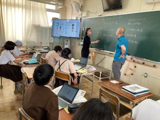 どんなものが食べたいですか?など、その国の特色を入れた質問のやりとりをしました。CネットのK先生と担任の先生が見本を見せてくれています。