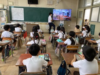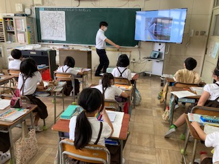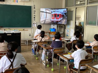 先生達が見つけてきた電車の動画を見せました。知ってる!乗ったことある!などの声。授業の導入部で、興味関心を持った子ども達。つかみは大成功です。