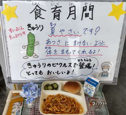 今日はスパゲッティミートソース、きゅうりのピクルス、アーモンドフィッシュ、ミニ黒糖パン、牛乳でした。給食のスパゲッティは具だくさんです。「おいしかった。」の声がたくさん聞けました。