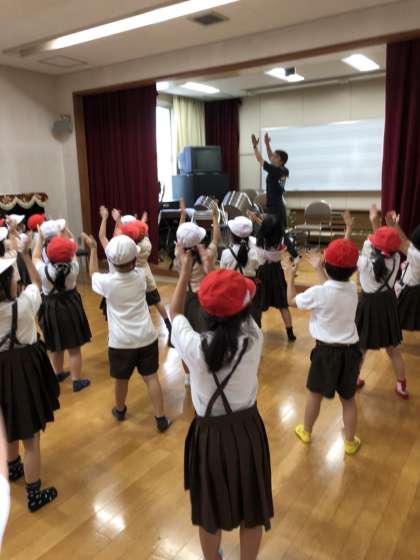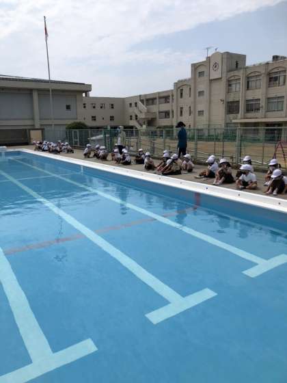 来週から始まるプール水泳学習に向けて、実際にプールサイドに行き、座る場所やバディを確認しました。安全確認のため、プールから上がったら、バディがいるか確かめるることを約束しました。その後、準備運動や、プールの中で踊るダンスをしました。