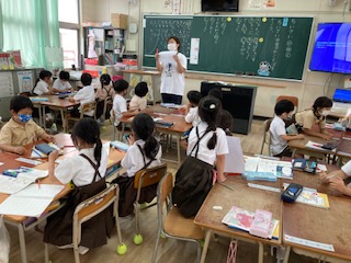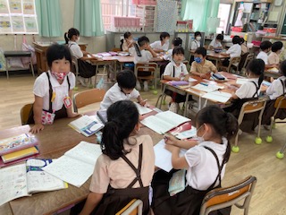 小さく書く「や・ゆ・よ」が出てくる言葉集めをグループでやりました。「ちんじゃおろーす」と、給食カレンダーを見て書く班もありました。よく気づきましたね!