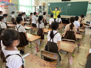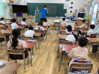 算数の直しや国語の勉強をした後、1時間目の終わり頃からプールに入る準備を始めました。着替える練習も何回かしたので大丈夫です。プールでの合図、1.2.3.4.5をもう一度確認しました。