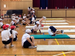 鉄棒とマットのテストをしました。とても暑いので、クスノキの木陰などで休み休みやりました。