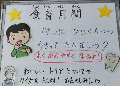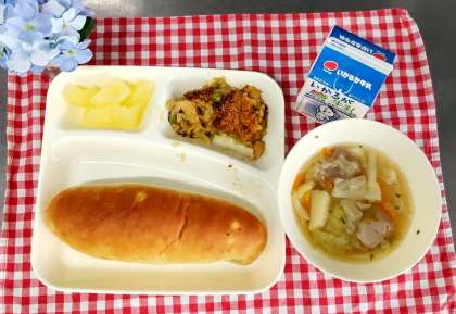今日はカレードリア、豚肉とキャベツのスープ、りんご(缶詰)、おさつパン、牛乳でした。ドリアは日本で考えられた洋食です。給食ではお米を朝からお湯につけて、丁寧に焼き上げました。