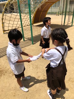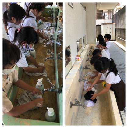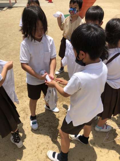 汚れた体操服は、洗濯をしました。自力で絞ったり、二人組で一緒に絞ったり、絞るのは一苦労ですが、なんでも楽しめる一年生です。お家でもお手伝いをしている子どもは「パンパンしたらしわが伸びるねんで。」と友達に教えていました。是非、家でたくさんお手伝いをさせてあげてほしいです。