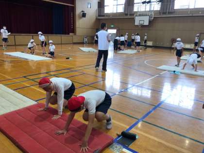 2組で体育の研究授業を行いました。「倒立系の技に挑戦しよう」をめあてに、ペアでアドバイスし合いながら倒立前転などにチャレンジしました。