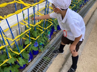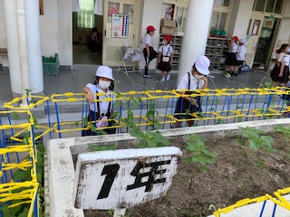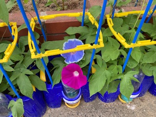 登校してアサガオの水やりをすると、紫や青の花が咲いていました!早く咲かないかなあと楽しみにしている子もたくさんいます。