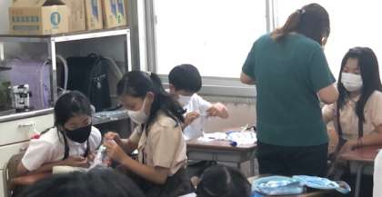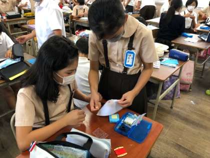 練習布を使って、手縫いの練習をしています。今日はボタンの付け方について学びました。早くできた子から友達同士で教え合っています。