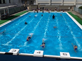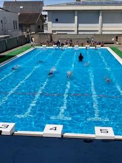 水泳学習がスタートとして2時間目。今日は、縦のコースで泳ぎました。バタ足、面かぶりクロール、クロールなど自分のペースで泳ぎました。途中、水筒のお茶を飲むなど、水分補給もしました。
