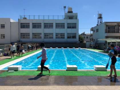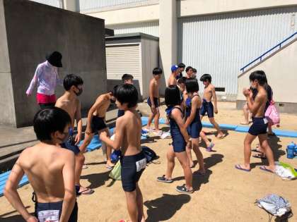 プールサイドは密になるので、今年度は運動場で準備運動をしてからプールに入ります。