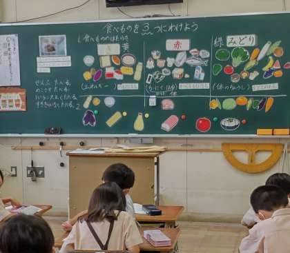 「食べものを3つにわけよう」の学習で三色栄養を思いだし、3つの働きの食べものをバランスよく食べるためにどうすればよいか考えました。