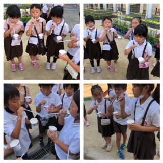 「なつのあそびをたのしもう」の学習で、泥遊びに引き続きシャボン玉遊びをしました。大きく膨らますにはどうすればよいか、いっぱいシャボン玉を出すにはどうすればよいか、遊びの中で気付きました。「どんな色?」と聞くと、ピンク、青、黄、赤など、一人一人感じる色が違っていておもしろいです。