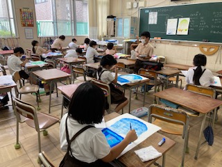 絵の具で好きなかき氷を描きました。水の量を調節して、何度も筆を洗いながら、点塗りで描いています。おいしそうなかき氷ができました!