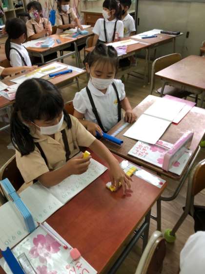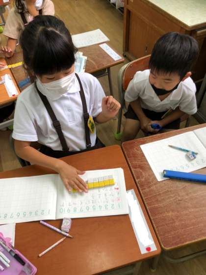 「ちがいはいくつ」の学習をしました。今までと少し違う問題に苦戦しつつも、友達と一緒に、どのようにブロックを並べたら違いがわかるか、考えました。ブロックで並べたら、もっと速く簡単に解くために、図や式に表して考えました。