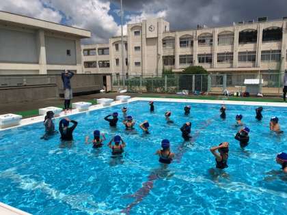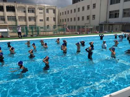 本格的な水泳の学習は、2年ぶりなので水なれから丁寧に指導しています。