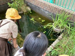 ビオトープの四角い池に、たまに姿を見せるイシガメ。一年生が見つけて、知らせてくれました。1年生が言うには、亀は、石に時々変身しているのだそうですよ。面白い発想ですね。