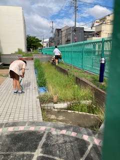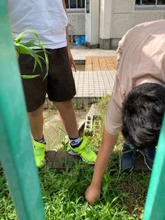 ビオトープの花壇に雑草が生えてきました。朝いつもバケツ苗を観察しにくる5年生が雑草取りをしてくれました。