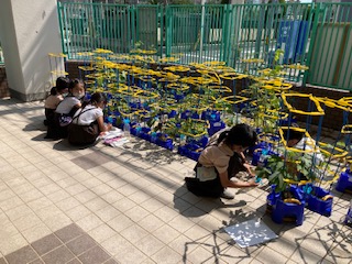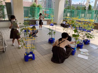育てている野菜が大きくなり、収穫もできています。カードに観察したことを書いたり、タブレットで写真撮ったりしました。