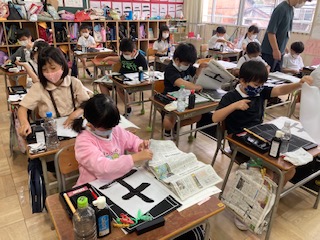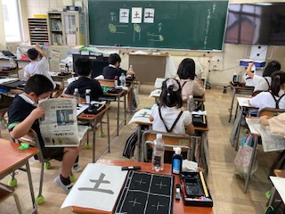 「土」を練習しました。始筆の筆の押さえ方は、先月の「二」の時にしっかりできていたので、今回は、縦画の場合の始筆、終筆に気をつけて、書きました。「太く書く」「一画目と三画目の長さに気をつける」などそれぞれ目標を持って書きました。