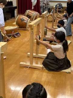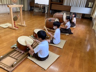 地域の方に、ゲストティーチャーとして来ていただき、クラスごとに太鼓と鐘のたたき方を教えていただきました。
