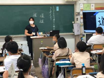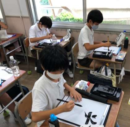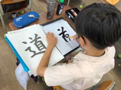 毛筆で「道」と書きました。自分でめあてを見つけ、赤ペンで書き込んでから清書に取り組みました。