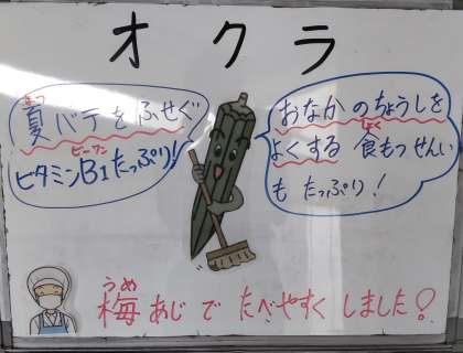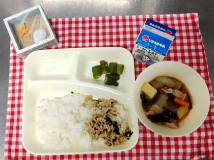 今日は豚肉とじゃがいもの煮物、オクラの梅風味、ツナっ葉炒め、ご飯、牛乳でした。