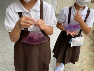 アサガオの花を使って、色水を作りました。花の色と色水の色が違っていることに気付きました。
