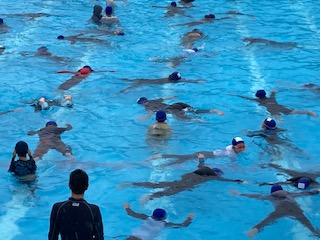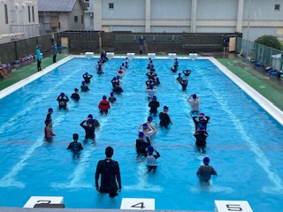 今日で水泳学習も終わりです。水難事故に遭わないように、服を着て水に浸かってしまった時、どうすれば身を守ることができるか学習しました。合言葉は、「浮いて待て!」です。