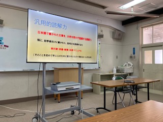 15時から、「総合読解力育成プログラム」について、伝達研修を行いました。言語能力の育成の7つのモデルと2つの力等について学びました。「リーディングスキルテスト」もみんなでやってみました。