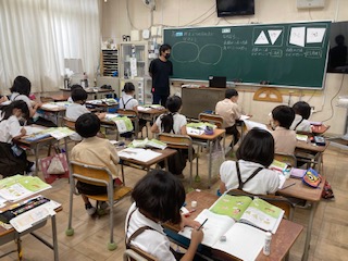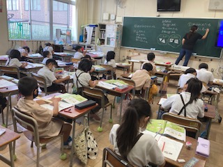 動物の絵を三本や四本の線で囲み、できた形を仲間分けしました。三角形と四角形の違いがわかりました。