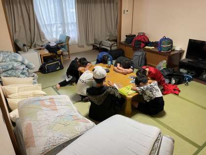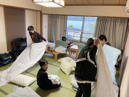 起床し、布団を畳んだり、部屋でくつろいでいる班もあります。