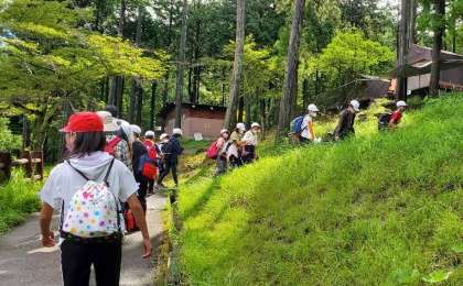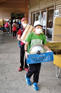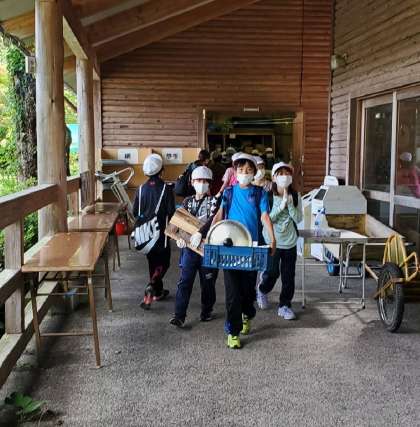 飯盒炊爨が始まります。食器、食材、道具をもらい、班ごとの所定の場所に移動しています。