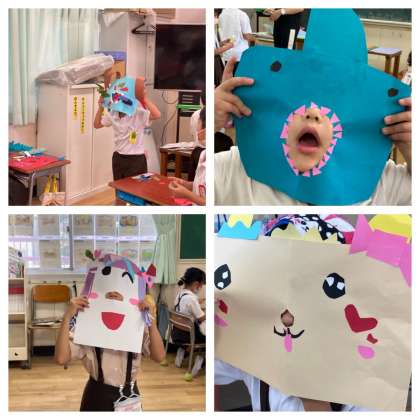 色画用紙でお面を作りました。できたお面をつけてみました。どれも工夫があって可愛いですね!