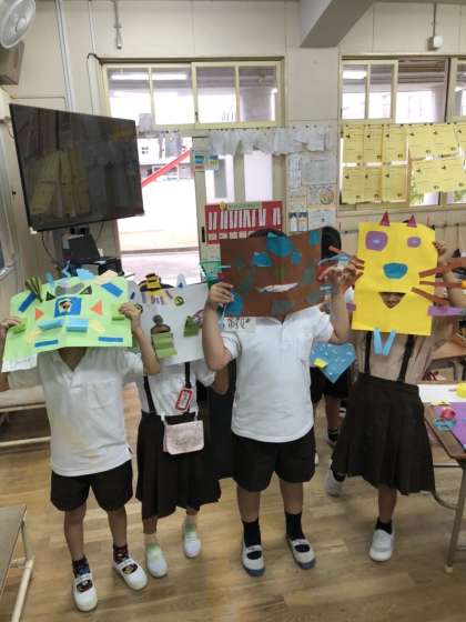 お面が完成しました。このお面をつけると、ウサギやロボットなど何にでも変身できます。イメージした形にハサミで紙を切ったり、画用紙を折ったり丸めたり、工夫して作りました。