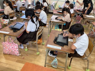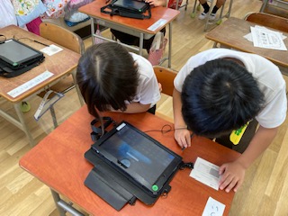 一人一台タブレットを使いました。電源を入れて立ち上げ、IDやパスワードの入力も、カードを見ながら挑戦しました。早くできた子は、教えてながら、再確認をしています。