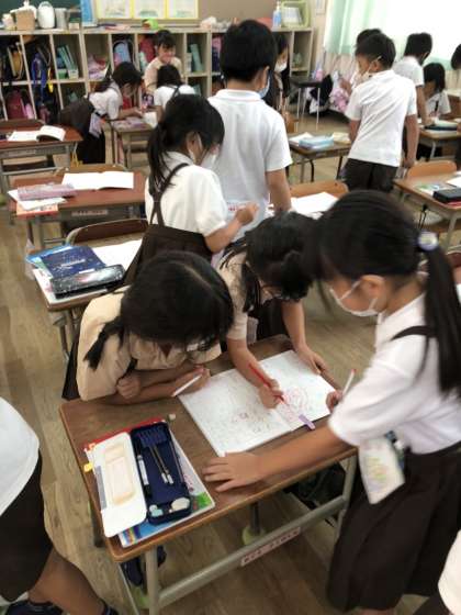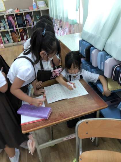 「ことばあそびうたをつくろう」の学習をしています。今日は、友達が作ったことばあそびうたを見て回り、いいなと思ったものに赤鉛筆で丸を書きました。戻ってくると自分のノートにも丸がついていて、嬉しそうでした。