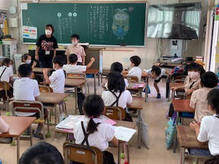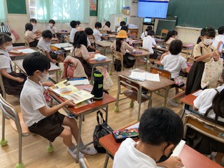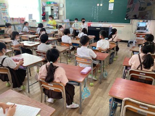 転入生があった2組では、自己紹介をした友達の話をじっと聞いていました。