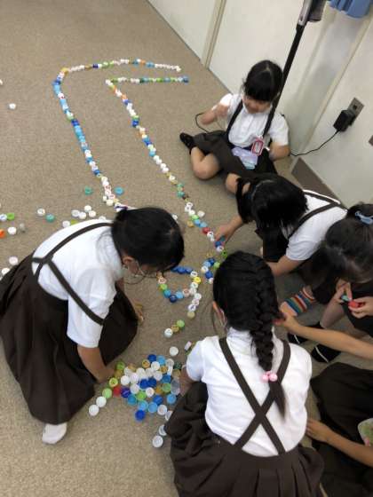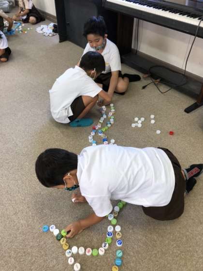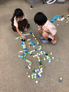 前回に引き続き、ペットボトルのキャップを使って遊びました。前回は自由に作りましたが、今回はもう少し視野を広げ、友達とイメージを共有しながら作りました。次はクラスで一つの作品を作れたらいいですね。
