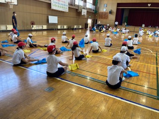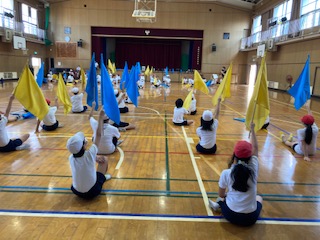曲をよく聞いて、どこでフラッグを上げたり下ろしたりするとよいかを練習しました。最後の運動会での勇姿が楽しみです。