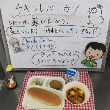 今日は、チキンレバーカツ、ケチャップ煮、キャベツのバジル風味サラダ、黒糖パン、牛乳でした。鉄は日本人に不足しがちな栄養素です。鳥のレバーには鉄がたっぷり含まれています。