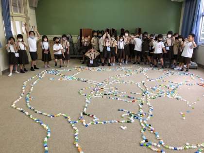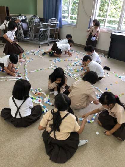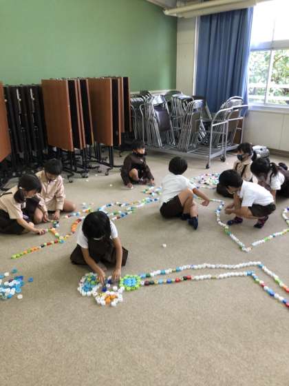 今日は「みんなで一つの作品を作ろう」をめあてに、活動しました。「そっちにつなげてもいい?」「ここをつなげよう」など、作品作りの話し合いも活発でした。また、一人で作っている友達に「一緒にしよう」と声をかけるなど、友達とのかかわりも広がりました。