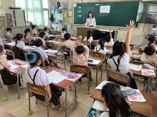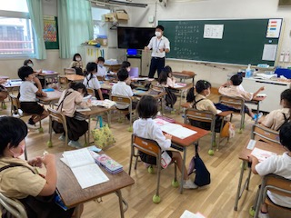 机の縦、横の長さを調べました。筆箱や下敷きなどを使って一人一人が調べた数値を見比べ、みんなが同じものを使って長さを調べないと比べることができないことに気付きました。そして、みんなが持っている計算カードを使って長さを調べると良いことがわかりました。