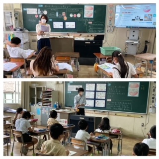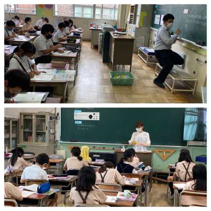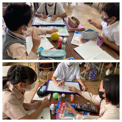 ボールや乾電池など形の違う物を二つのグループに分類しました。なぜそのように分けたのかも理由を考えました。そこから新しく「球」について学習していきました。球にも中心や半径、直径があることを確認しました。3年生は、3クラスを4分割して学習を進めています。